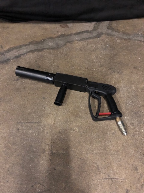 手持ちGUNスタイル仕様のCo2効果。電源不要。噴出される煙は、炭酸ガスが液化した極低温の状態で空気中に放出された際に空気中の水分が凝縮して白く見える変化を流用した特殊効果です。