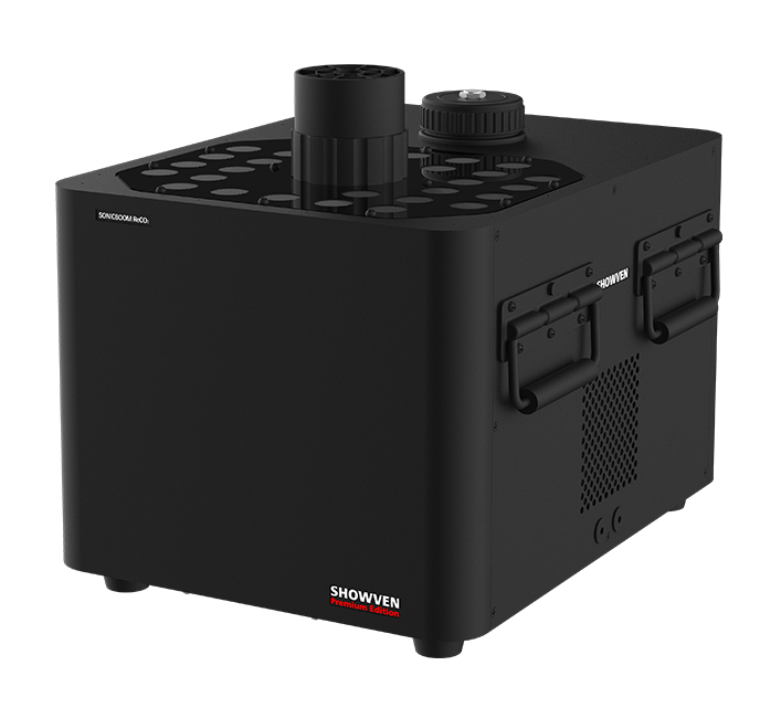 SONICBOOM ReCO2は、SONICBOOMプラットフォームから進化したリアルCO2 JETシミュレーターです。5Lのタンクを内蔵し、大型CO2ガスボトル15本分のスモークを10分間発生させることができます。SONICBOOM JETと同様、9W LEDを30個内蔵し、スモークをよりカラフルに演出します。