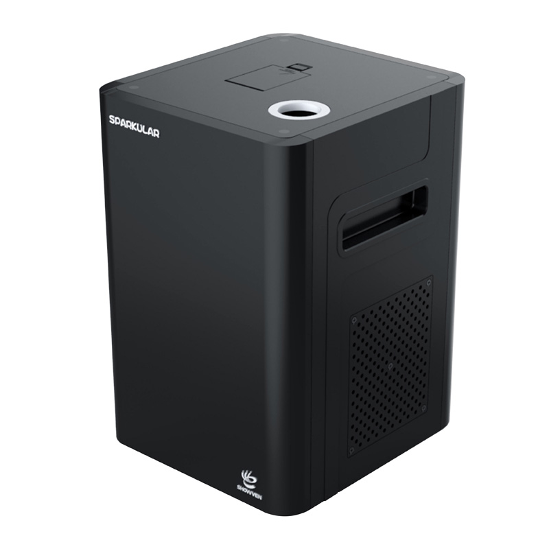 チタン合金粉末を本体内で電磁波を用いて加熱させ 空気圧で空中に放出する事で従来の「吹き出し花火」 のような効果を上から振り下ろす演出表現する機器。